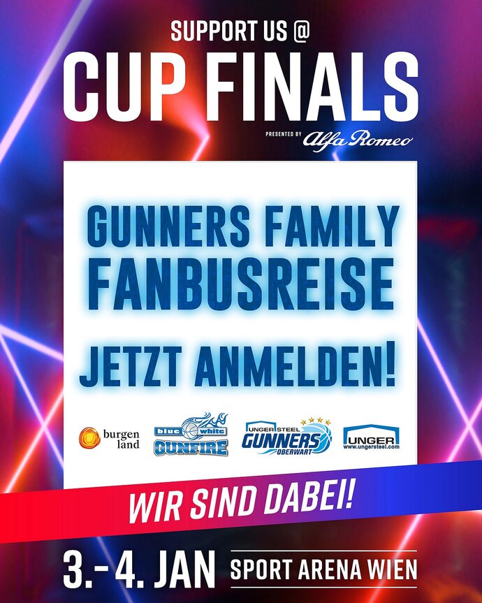 Wir bitten nicht nur unsere treuen und reisefreudigen BW Gunfire-Fans, sondern auch alle anderen Fans, Dauerkartenkunden, Nachwuchsspieler:innen und Eltern, unser Team am Sa. 03.01. in der neuen Sportarena Wien zu unterstützen.
